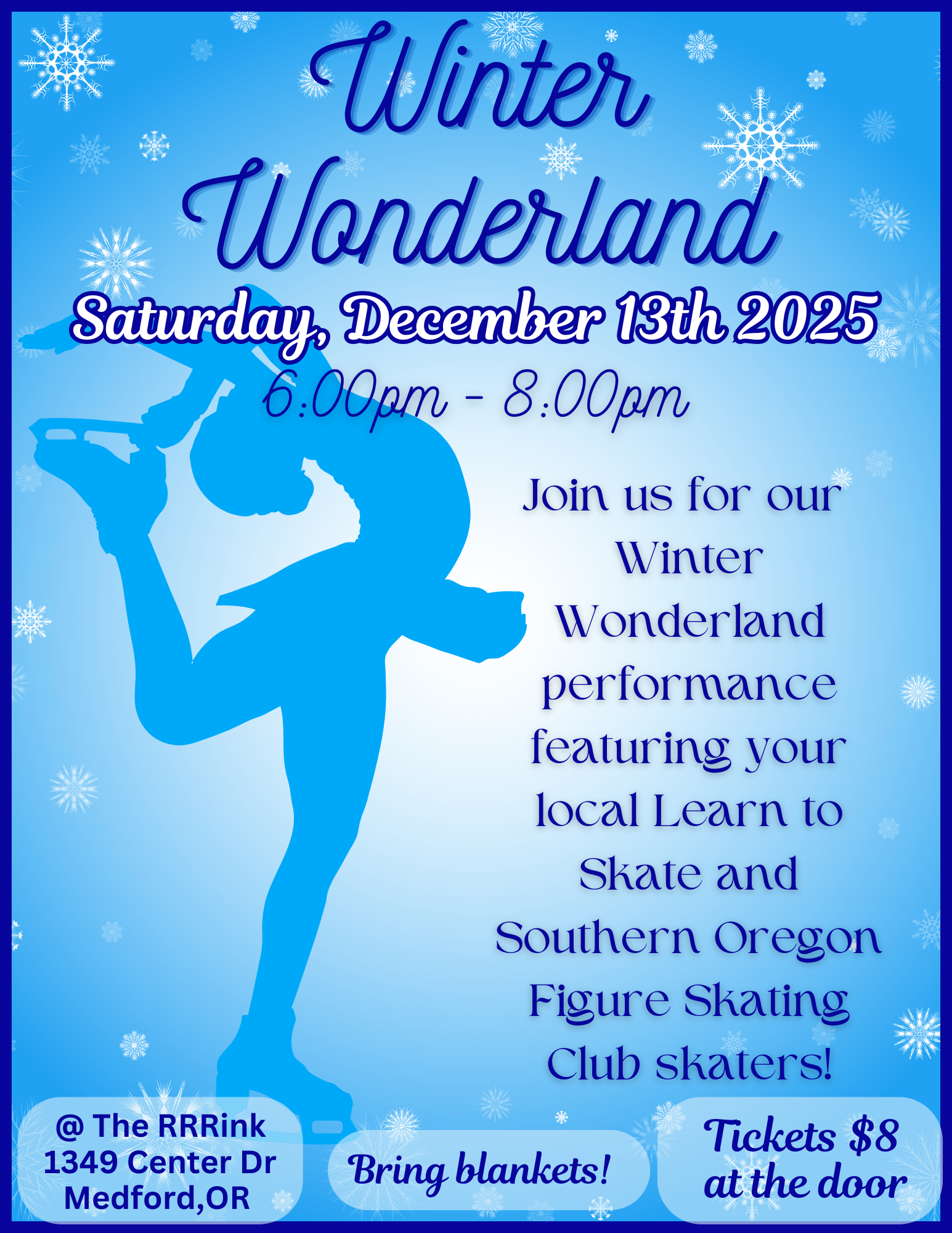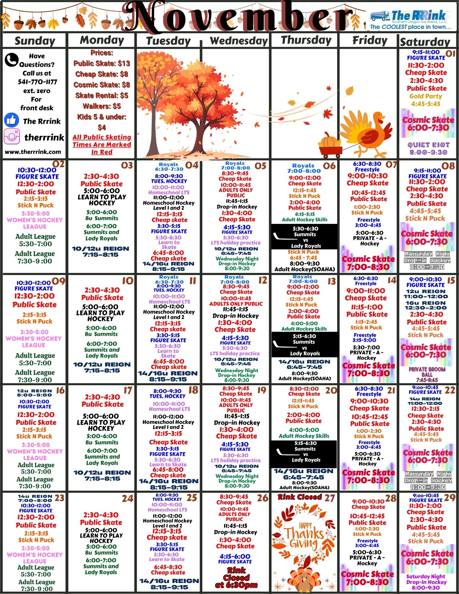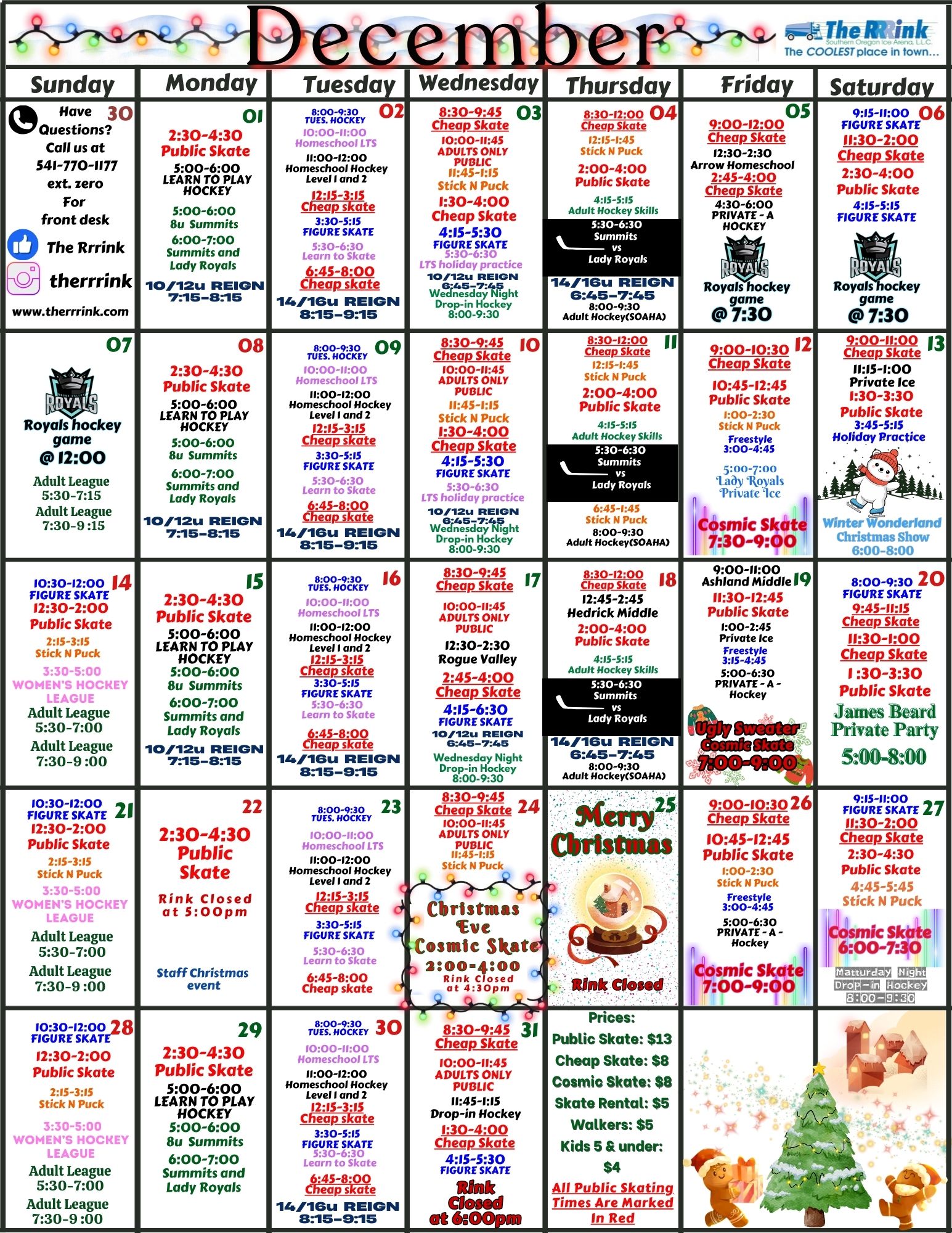 Our public skate times vary by the day. Check our calendar below for the current schedule.